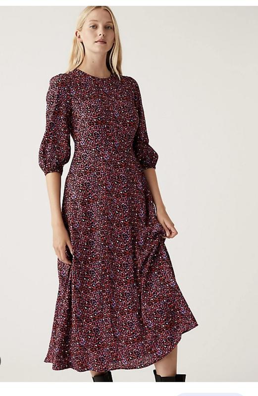 Плаття від M&S, p 8, на S, або невеличка М, віскоза, довжина 130 см, в грудях н/о 45-48 см, в поясі н/о 36-38 см, в бедрах н/о 50-51 см, рукав 3/4- 44 см, по спинці блискавка