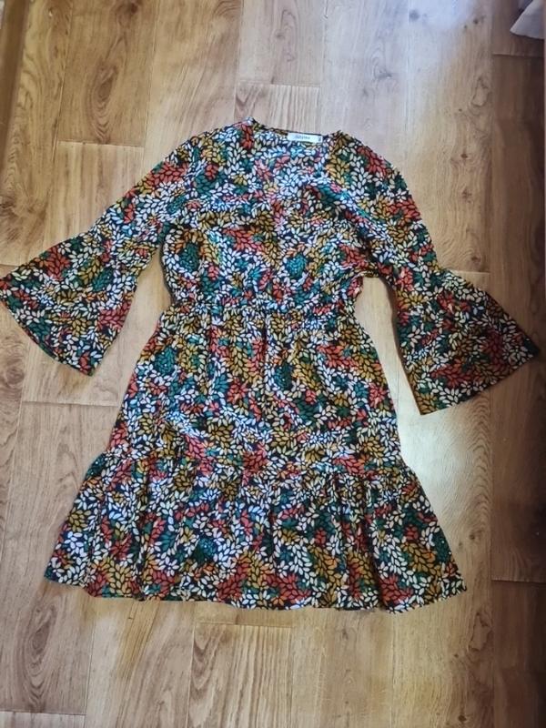 До колен, на поясе резинка, глубокий вырез красиво подчеркивает грудь.Приятная ткань.В низу сшита воланом. В идеальном состоянии.