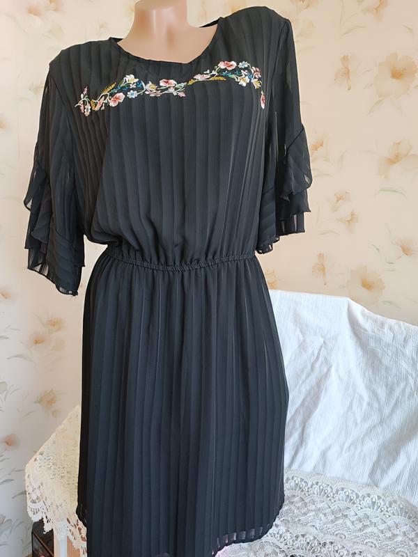 Очень красивое брендовое платье черного цвета с вышивкой гладью. Полупрозрачная лёгкая ткань в полоску, имитирующая плиссе. На подкладке. Прямого кроя, в поясе на резинке. Круглый вырез горловины. ПОГ-ПОТ-ПОБ 54-42(тянется до 54)-64 см. Длина по спинке 97 см. В плечах 42 см. Длина рукава от плеча 35 см. Рукав красивый, ярусный. Смотрится потрясающе, очень стильно и эффектно. Абсолютно новая вещь без бумажной бирки. Следы ношения отсутствуют. Дефектов нет.