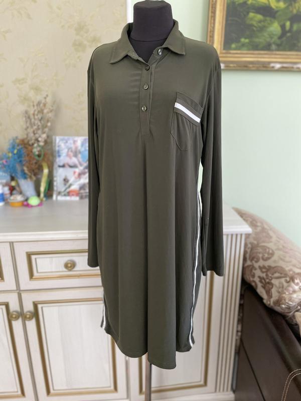 платье из плотного трикотажа "масло" по бокам лампасы, темно оливкового цвета, в идеальном состоянии, без нюансов, р-р XL. длина 96, длина рукава 62, плечо 12.5, ПОГ 53, ПОС 55.