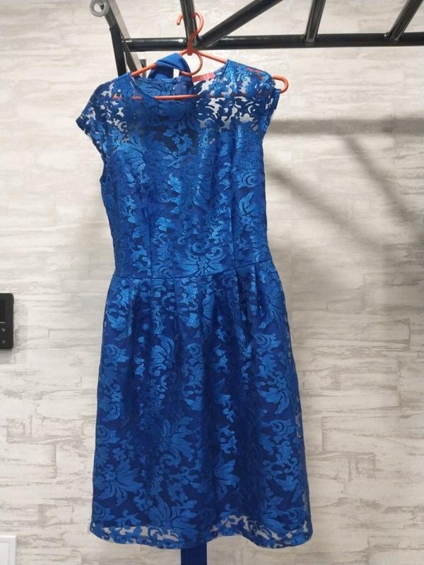 Платье синее, цвета электрик, кружное, надета несколько раз, выглядит как новое, с пояском, размером S.