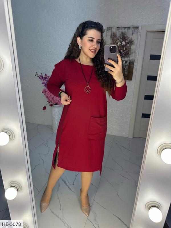 со Сукня HE-5078 модель 537vl Размиры: 50-52, 46-48, 54-56, 58-60, 62-64, 66-68 Цвет-красный, бутылка, черный, шоколад, серый Тканина-двухнитка Свободное платье, длинный рукав, сбоку слева рабочая молния с кольцом от груди до низа платья, справа сбоку карман. Передняя часть немного короче задней. Украшение входит в комплект (фото оригинал в альбоме, кулон немного отличается) Параметры внешнего шва изделия: 46-48: ог107, вот107, об107, рукав от шва 53см, длина спереди 102, длина сзади 110см, 50-52: ог115, от115, об115, рукав от шва 54см, длина спереди 103см, длина сзади 112см, 54-56: ог123, от123, об123, рукав от шва 55, длина спереди 105см, длина сзади 114см, 58-60: ог131, от131, об131, рукав от шва 56см, длина спереди 108, длина сзади 116см, 62-64: ог140, от140, об140, рукав от шва 57, Длина спереди 110, длина сзади 118см, 66-68: ог146, от146, об146, рукав от шва 57см, длина сзади 120см.