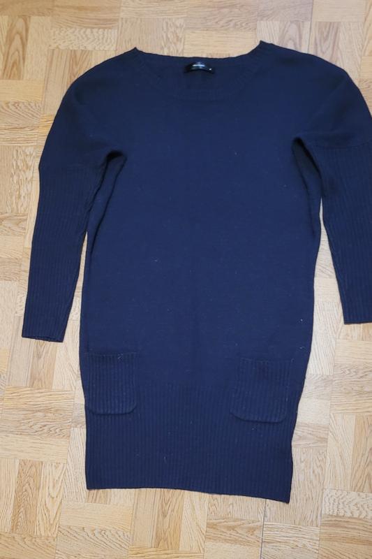 Очень теплое и качественное платье- свитер темно- синего цвета. Приспущеное плечо. Длинные рукава - лапша. Резинка трикотажная по низу. 2 маленьких накладных карманчика. Немецкое качество. В составе шерсть и ангора. Длина 88 см, рукав от горловины 70 см пог 55 см, ширина по низу 43 см