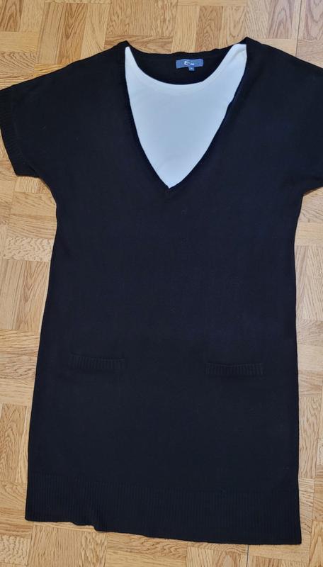 Очень интересное с глубоким вырезом платье черного цвета. Трикотаж. Без рукавов. Приспущеное плечо. Имитация карманов. Длина 95 см, плечо 30 см, пог 50 см, ширина по низу 50 см.