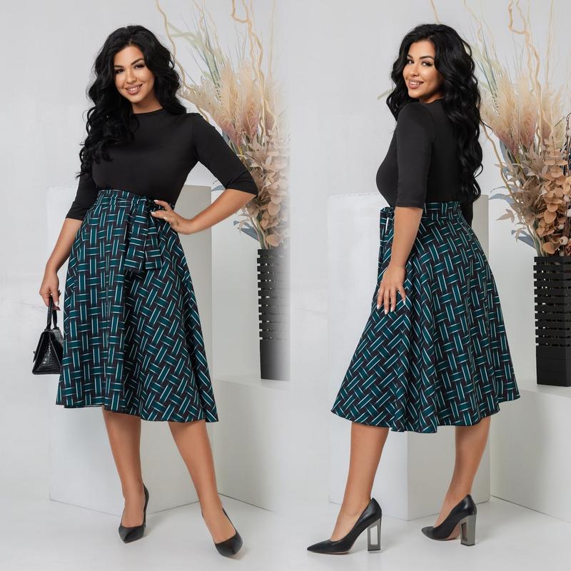 Сукня арт. david. 7390-1 Размер: 46-48; 50-52; 54-56; 58-60 Тканина: трикотаж + креп - костюмка Длина платья: 115 см. Длина рукава: 38 см. Стильное яркое платье с отрезанной талией, с пышной юбкой. Пояс из основной ткани идет в комплекте. Ткань приятная на ощупь, высокого качества, не скатывается.