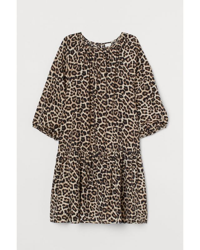 Короткое платье-трапеция из тканого материала с круглым вырезом горловины на сборке и разрезом сзади с пуговицей на шее. Пышные рукава реглан длиной три четверти с узкой окантовкой тесьмой. Собранный шов снизу для дополнительного объема. Без подкладки. Цвет леопардовый Размер из этикетки L Напівобхват 57, рукав реглан, довжина від коміра 56, талія 70, довжина 93, Ширіна в самому низу 123. Состав 79% вискоза, 21% полиамид Країна бренда Швеція Состояние как новый Замеры по запросу