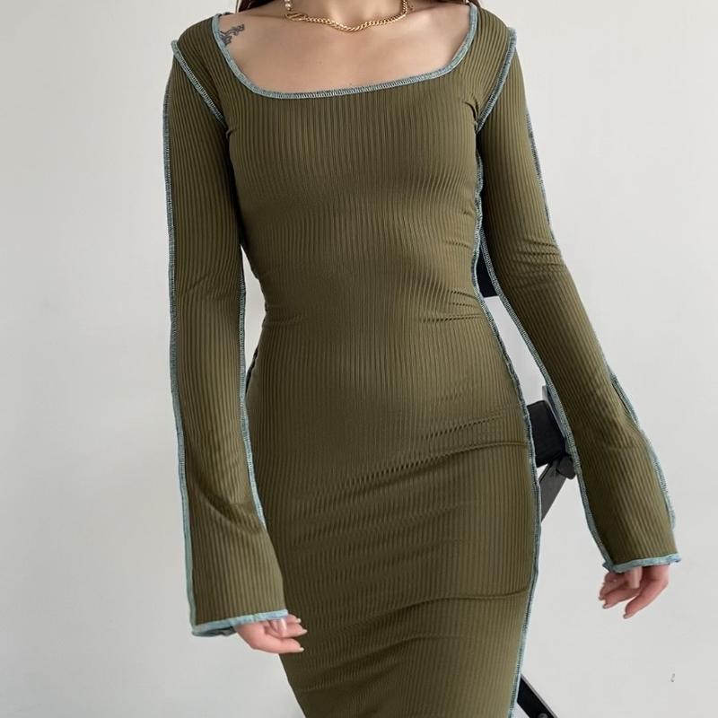 Платье миди со швами в рубчик трикотаж хаки, шикарное декольте, рукава клеш