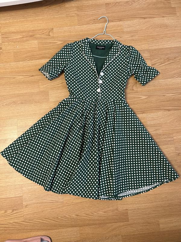 Вишукана сукня, з пишною спідницею. Має підкладку. Короткий рукав з закоченим шаром. Глибоке декольте на ґудзиках.