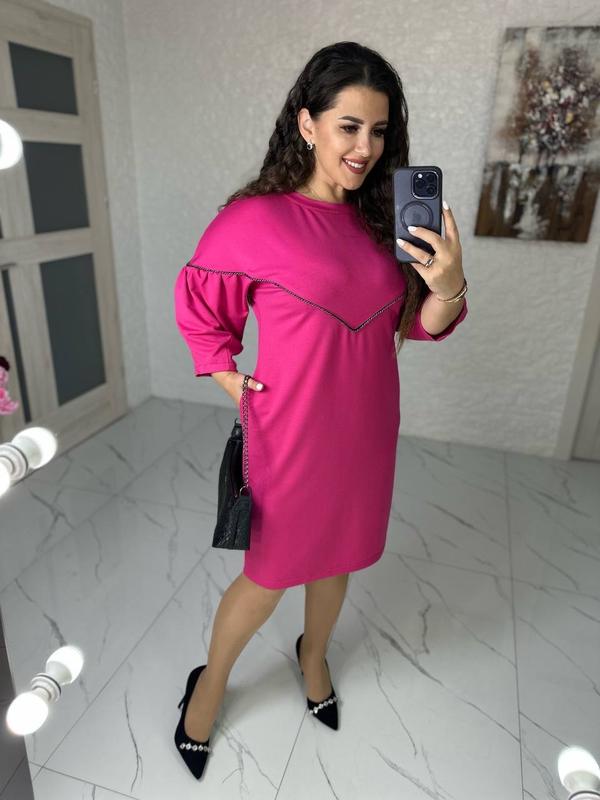 Платье Модель 882VL Размеры: 42-44,46-48,50-52,54-56,58-60,62-64 Ткань: двунитка (Китай, хорошего качества) Цвета: трава,малина, голубой, беж, черный Свободное платье, украшенно кантом (как на фото), рукав-фонарик ниже локтя на манжете. Параметры модели-нормы 95-65-95, рост 170см, на ней одет 42-44, параметры модели -батал 110-86-110, рост 165см, на ней одет размер 50-52. Замеры по внешнему шву изделия: 42-44: ОГ88-ОТ86-ОБ96, рукав от горловины 53см, длина по спинке 96см; 46-48: ОГ98-ОТ96-ОБ106, рукав от горловины 54см, длина по спинке 98см; 50-52: ОГ114-ОТ110-ОБ124, рукав от горловины 58см, бицепс 52см, длина по спинке 100см; 54-56: ОГ120-ОТ118-ОБ130, рукав от горловины 59см, длина по спинке 104см; 58-60: ОГ130-ОТ130-ОБ138, рукав от горловины 62см, длина по спинке 107см; 62-64: ОГ140-ОТ138-ОБ150, рукав от горловины 66см, длина по спинке 108см;