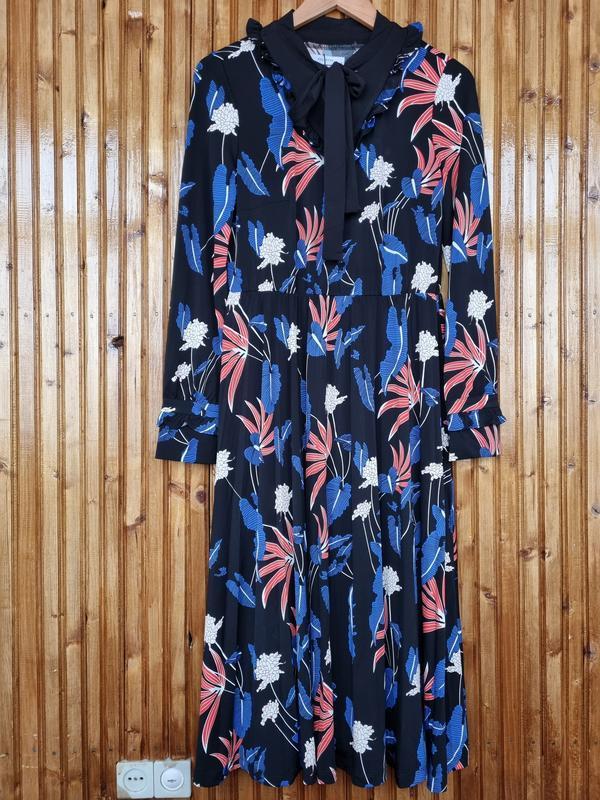 Стильное платье-миди Reserved с воланами и завязками на горловине. В наличии размер 36. Ткань хорошо тянется. ПОГ 44 см ПОТ 35 см, на резинке ПОС свободно, около 68 см Длина 111 см Рукав-61 см Ширина по плечам 37,5 см Смотрите, пожалуйста, все мое объявления — огромный выбор платьев и блуз H&M, Zara, Mango, Asos, Reserved ********************************** Подписывайтесь – частое пополнение ассортимента!)