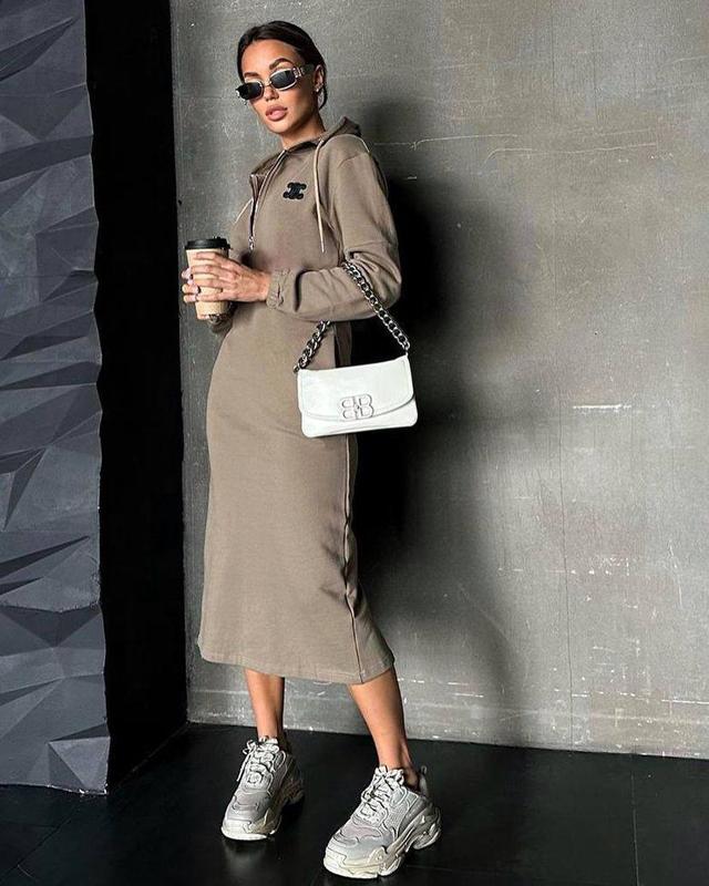 Новинка в наличии 🥰 💥Сукня Модель al 275 ▫Тканина - двухнитка люкс ▫Размеры - 42-46 универсальный ▫Цвета - черный, мокко ▫ Идеальное платье в спортивном стиле, свободного кроя, с капюшоном, нашивка как на фото!!️ Супер качество🤩