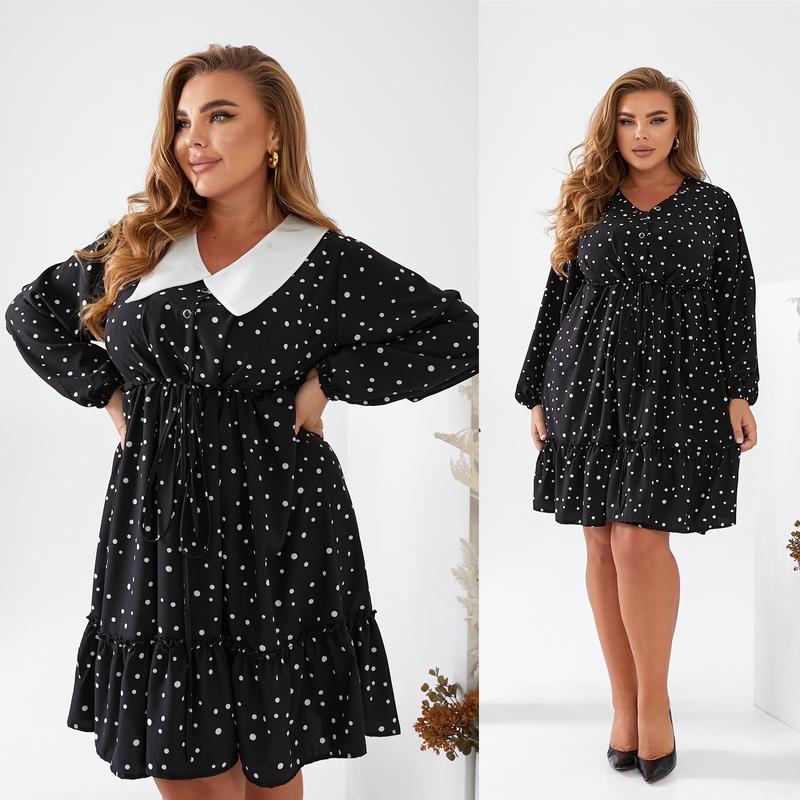 #1399 Розміри 42-46,48-52,54-58 Ціна 840 грн Тканина супер софт люкс якість Кольори чорний однотон, чорний в горошок, чорний фон з квітками, темно-зелений з квітками Сукня йде оверсайс, талія на кулісці( можна регулювати, підходить навіть вагітним), комір застібається на ґудзиках, можна носити і без коміра теж гарно Заміри сукні 42-46 Ог 110 от 110 бедра оверсайс до 140см, довжина рукава 68 см на резинці, довжина сукні 94 см 48-52 Ог 124 см от 124 бедра оверсайс до 170 см, довжина рукава 71 см,довжина сукні 97 см 54-58 Ог 134 см, от 134 см, об 180 см, довжина рукава 74 см, довжина сукні 100 см На моделі 48-52 її параметри Ог 110 от 85 см об 111 см, зріст 170 см