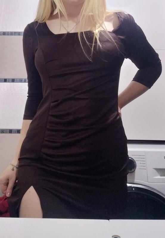 Красивое темно коричневое платье По фигуре С небольшим вырезом на ноге Абсолютно новое с биркой Размер S Ткань немного тянется Рукав не длинный Замеры: ПОТ - 35 см ПОГ - 42 см Плечи - 37 см Длина от плеча - 86 см Рукав - 38 см