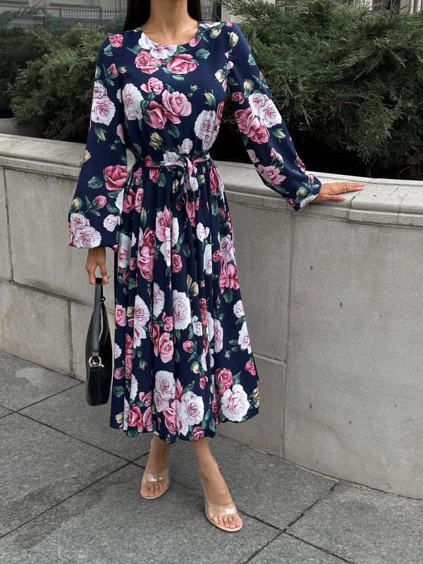 Плаття міді з квітковим принтом та вільною спідницею темно-синє з трояндами