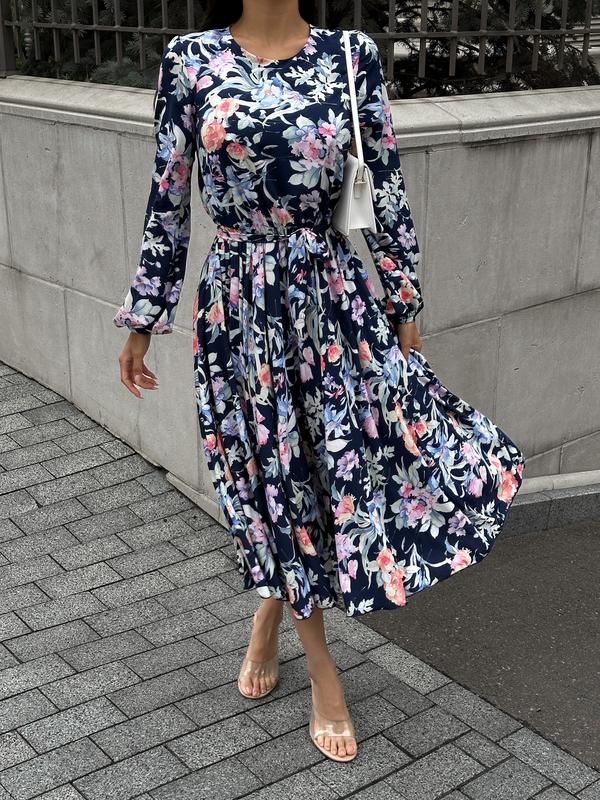 Платье миди с цветочным принтом и сводобной юбкой темно-синее с цветами
