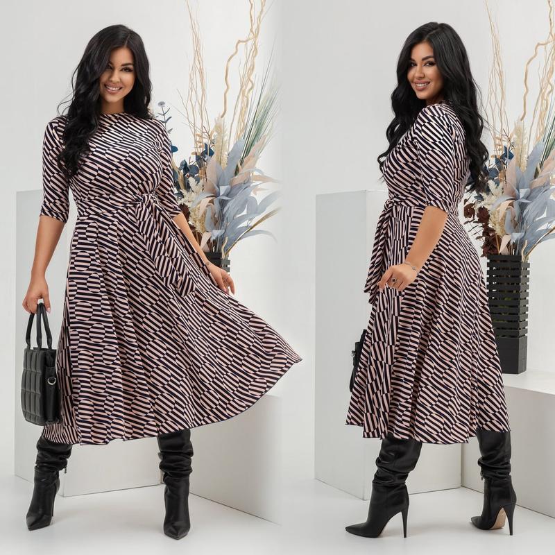 Сукня арт. david. 7396-1 Розмір: 46-48; 50-52; 54-56; 58-60 Тканина: трикотаж Довжина сукні: 124 см. Довжина рукава: 38 см. Стильна яскрава сукня з відрізаною талією, з пишною спідницею. Пояс з основної тканини йде в комплекті. Тканина приємна на дотик, високої якості, не кошлатиться.
