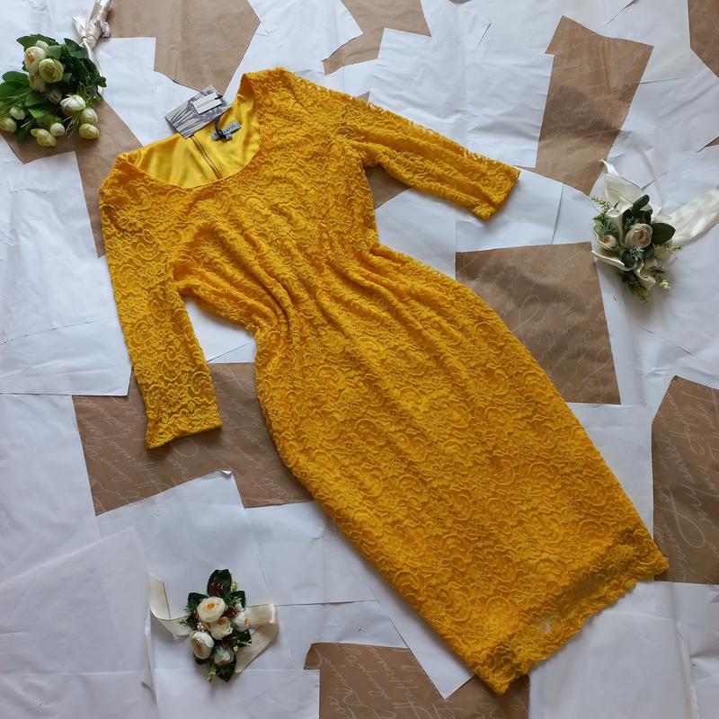 Красивое и яркое кружевное платье желтого цвета. Приталенный силуэт, по спинке застежка. Очень красиво тянется. Состояние: новое с картонной биркой Размер 14 (L-Xl) Полуобхват груди 44-56см Полуобхват талии 43-53см Полуобхват бедер 52-64см Длина 102см Рукав 47см (3/4)