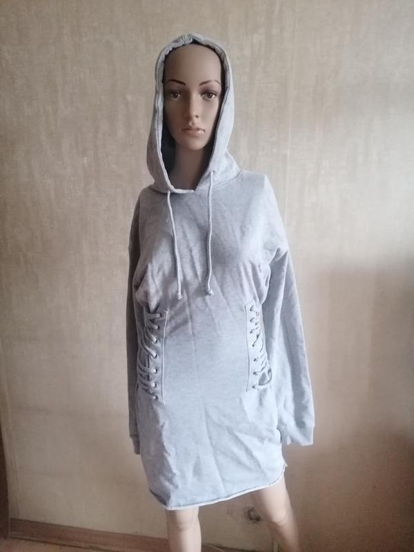 Серое платье-реглан со шнуровкой и с капюшоном PrettyLittleThing (к086) рр 8 55% полиэстер 45% катон