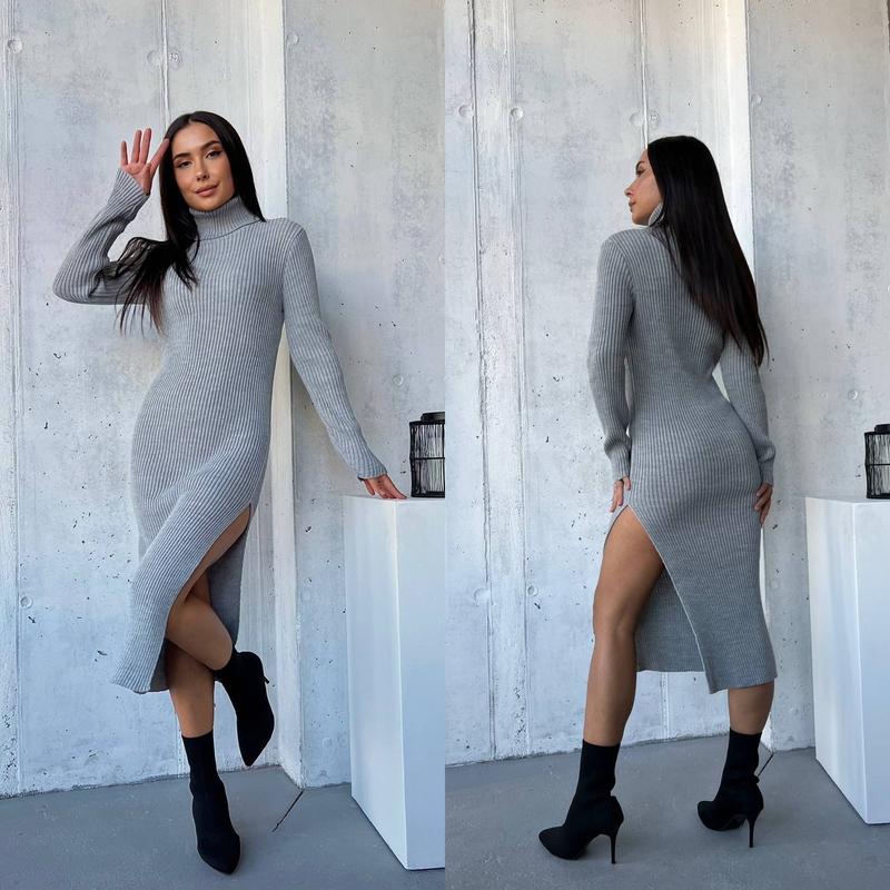 Вязаное платье - гольф в длине меди арт. aos. 117 Размер: oversize 42-48 Двойная вязка Акрил + шерсть Цвета: черный, пудра, серый, карамель, бутылка Платье с высоким воротником. Изделие выполнено из мягкой, приятной к телу пряжи с содержанием шерсти и акрила. Длина миди. Крой приталенный. Длинные узкие рукава. С боку декоративный разрез.