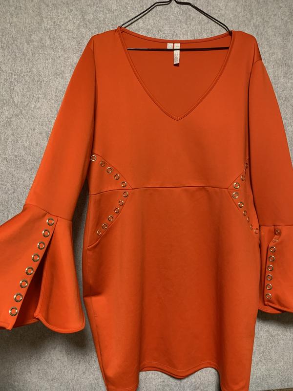 Нереальне плаття, по силуету, з декольте, вставками, що візуально роблять більш виразну талію і дуже гарними рукавами кльош Розмір вказаний на бірці XL Напівобхват грудей: 58см, тягнеться до 71см Напівобхват талії: 55см, тягнеться до 68см Напівобхват бедер: 63см, тягнеться до 79см Довжина виробу:97,5см