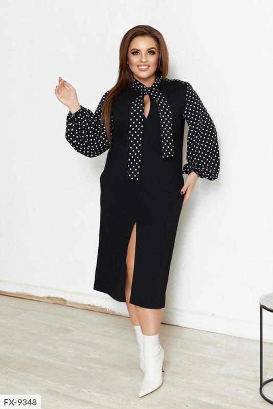 соСукня FX-9348 мод SF23-713 Розмiри: 48, 50, 52, 54, 56, 58, 60, 62 Тканина : креп - стрейч, шовк - стрейч в горошок на рукавах і оздоблювальних деталі Широкий рукав зібраний по низу на приховану гумку Ґудзик з золотого металу Кишені в бічних швах Атласна обробка внутрішніх швів Довжина виробу від 1м 10 см по центру спинки Довжина виробу пропорційно збільшується від розміру.