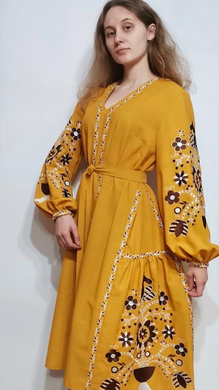 Современное вышитое платье. Платье с геометрически-растущим орнаментом. Манжетики застегиваются на пуговицах. Машинная вышивка. Техника мелкая гладь. В наличии 48 размер. ПОГ-56см. Длина рукава от плеча 63 см. Длина изделия 114 см. Ткань лен с хлопком. Платье с втачными рукавами, под пасочек. Со стороны вшиты клинья и потайные карманы. Со стороны вшиты клинья и потайные карманы. Пояс длиной 2 м. Может быть под заказ по вашим индивидуальным меркам. Срок выполнения заказа до 14 рабочих дней.