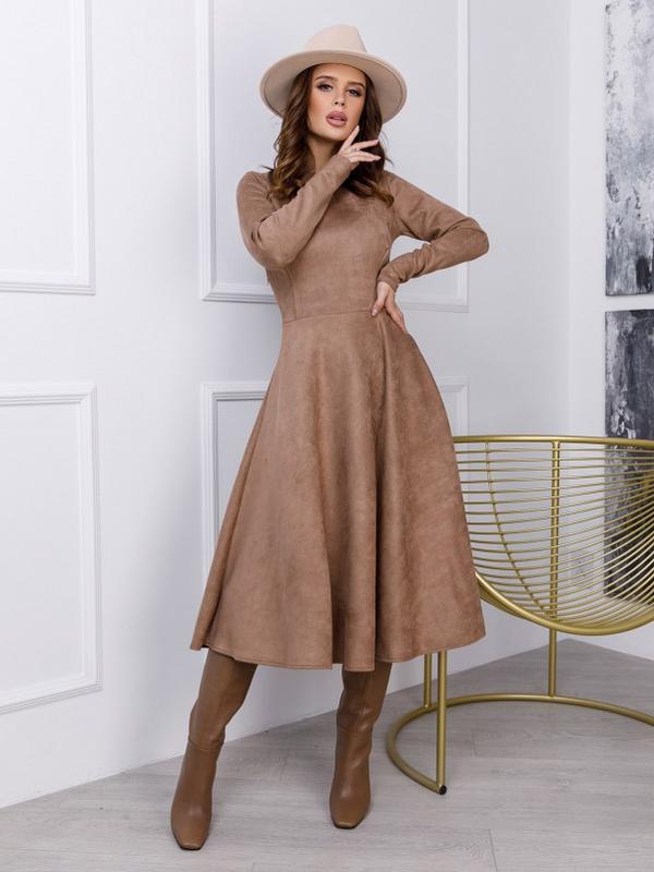 12284_бежевый Классическое платье бежевого цвета выполненное из эко-замши с приталенным кроем и расклешенной юбкой-колокол миди длины. Платье оснащено формирующими силуэт вытачками, длинными рукавами и небольшим вырезом на спинке. Сбоку потайная застежка-молния.