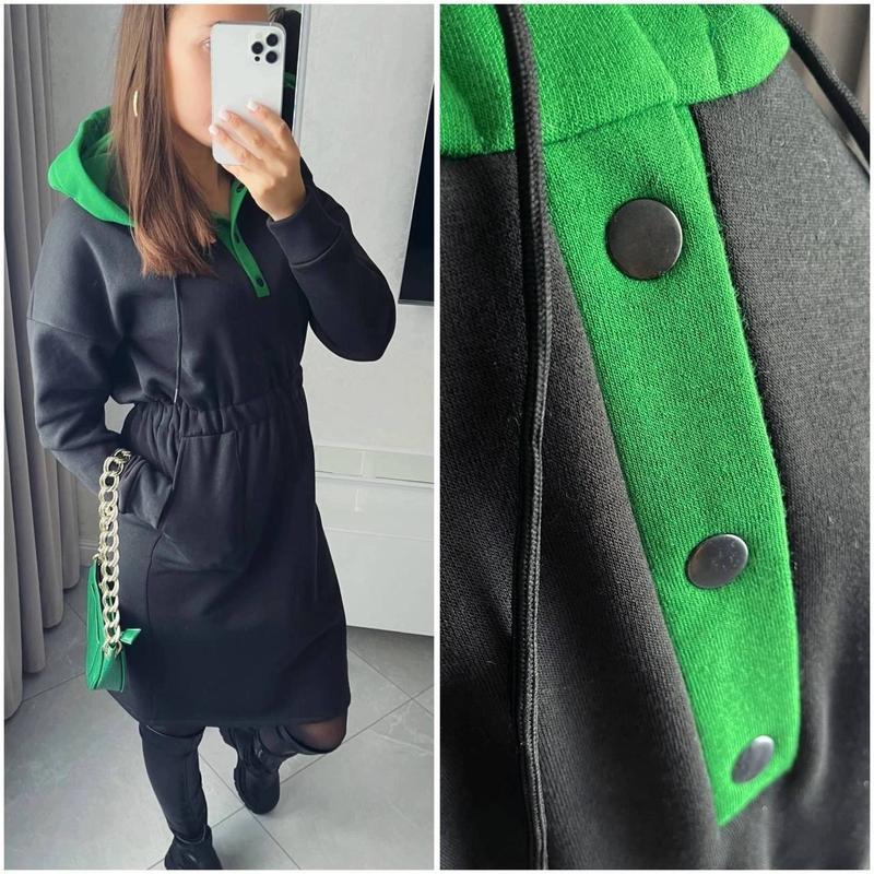 Сукня Модель 350 Цена 670 грн Размер 42/46, 48/52 Ткань тринитить на флисе Турция Спортивное платье с капюшоном, теплое и уютное, станет фаворитом в вашем осенне-зимнем гардеробе. Пояс на широкой резинке, боковые карманы, удобный капюшон и воротник на черных кнопках, шнурок в капюшоне черный. Цвета по капюшоне: хаки, беж, зеленый, горчица и черный