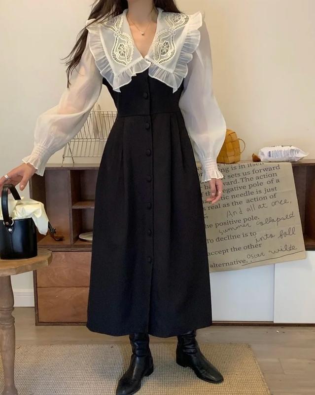 Платье с воротником новое, размер универсальный с-м, сзади завязывается поясом. Спереди пуговицы все расстегиваются. Стильна. 45см под рукавами. Рукав от плеча 61см. Длина по спине 119см.