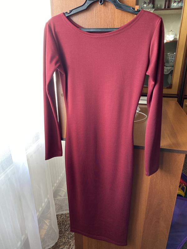 Довге трикотажне плаття в кольорі Бордо, довгі рукава.Плям немає. Стан ідеальний. Трикотаж плотний, якісний. Довжина плаття ниже колін - довжина міді. Підійде на худеньких дівчат. Також можна зробити розріз на ножці, так зараз модно😉