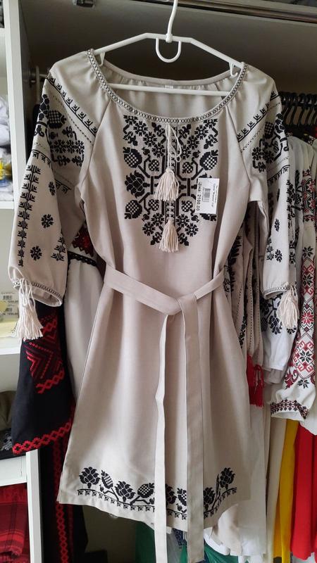 Фабричное производство высокого качества Машинная вышивка Основа беж Рукав 3/4 Ткань - платьевое полотно - вискоза Платье прямо с поясом, вышивка крестиком. Размер 42-56