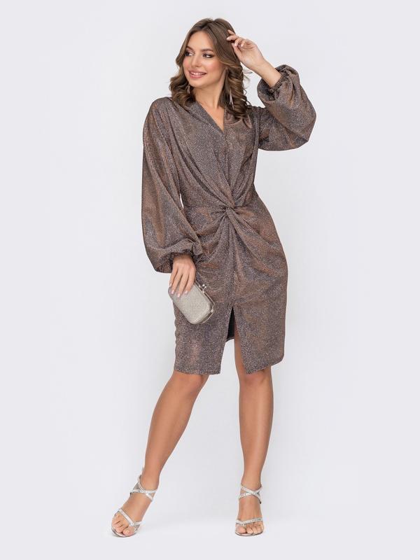 Мерцающее платье приталенного кроя с разрезом спереди. Объемные рукава с эластичной деталью на манжетах. Силуэт подчеркивает узел по талии. Застегивается по спинке на молнию. На модели представлен 44 размер: длина по спинке – 95 см; длина рукава (от плечевого шва) – 62 см.