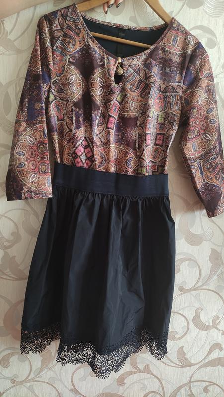 Красивое и качественное платье в отличном состоянии. На талии широкая резинка, соединяющая юбку с верхом. Молния сбоку. Снизу качественное кружево. Рукав 3/4.на горловине небольшой вырез в виде капельки. Длинна 87 см до кружева (94 см с кружевом) Длинна плеча 8 см, рукавчик 45 см, полуобхват груди 47 см, полуобхват талии 34 см (верхняя часть ткани немного тянется, поэтому может спокойно одето на талию с больше объёмом)