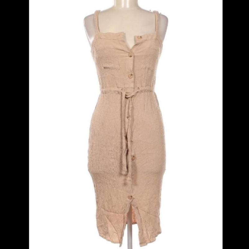 Муслиновое платье, длина миди. На широких брителях, и поясом, который подчеркивает талию.