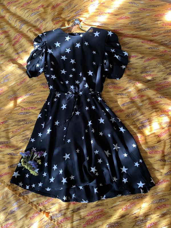 Черное летнее платье в разнообразную белую звездочку. Спинка открытая, застежка - капелька