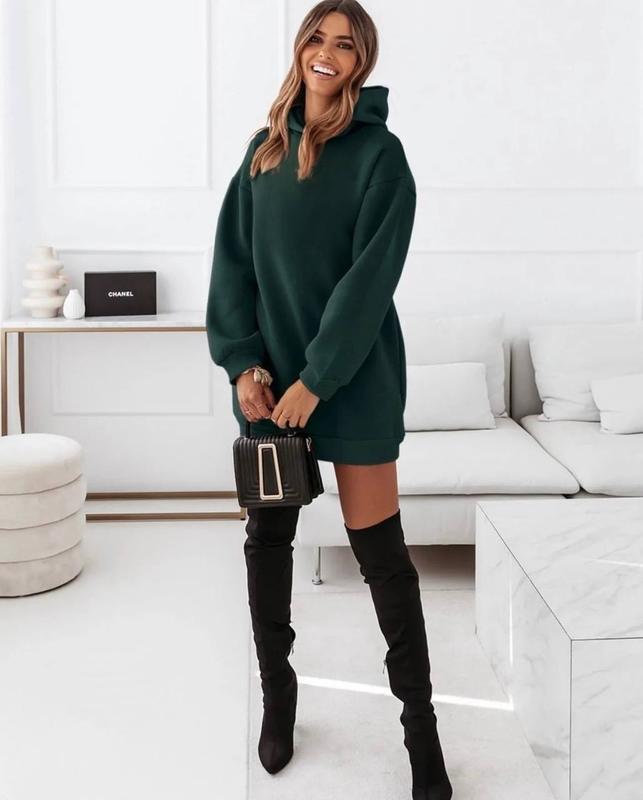 Ан 11.11 Туника женская! Мод 850/0060 Ткань трехнитка на флисе Размеры 42-46; 48-52 Длина 80 см Цвета черный, стальный, бутылка, латте Базовая вещь на каждый день С капюшоном