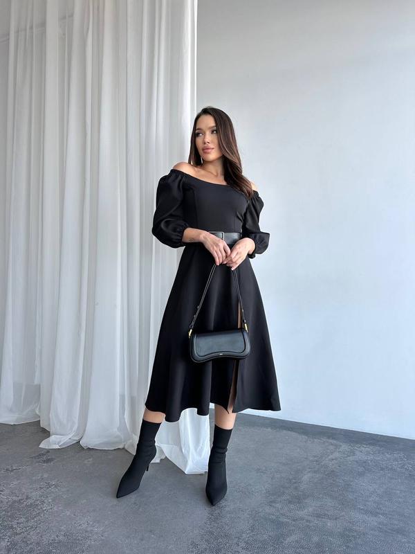 Женское платье с пояском Тканина костюмна Размерный ряд S,M,L,XL Цвет черный Застегивается на потайную молнию Разрез по ножке, рукава на резинке Супер качество У комплекті поясок Цена 730грн