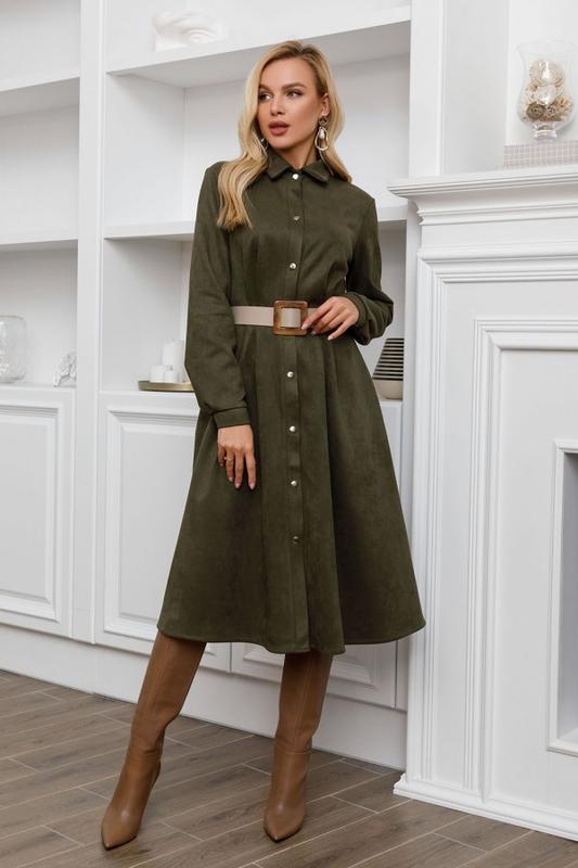 85_хаки Повседневное офисное платье-рубашка на кнопках выполненное из мягкой эко-замши цвета хаки. Модель с воротником оснащена длинными рукавами с манжетами и сборками на талии. Платье миди длины с расклешенной юбкой и карманами. Платье оснащено съемным замшевым поясом с пряжкой. Пояс с фото в комплект не входит.