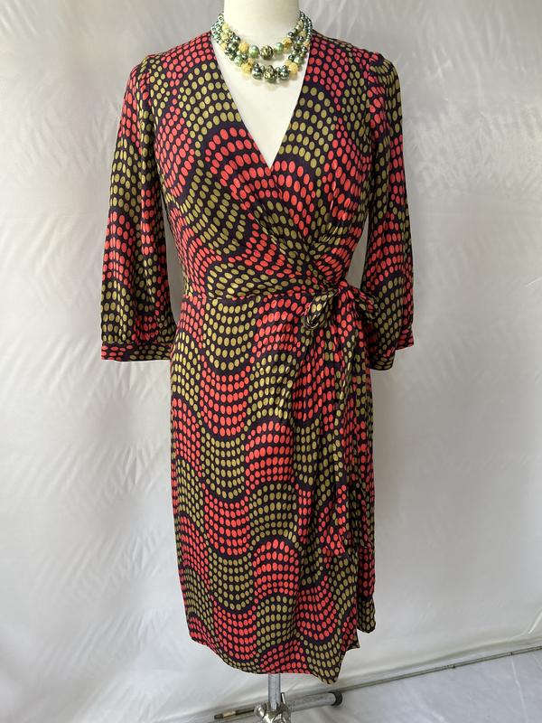 Платье фасона на запах, на коралловом подкладе, состав 63% вискоза 37% шелка.