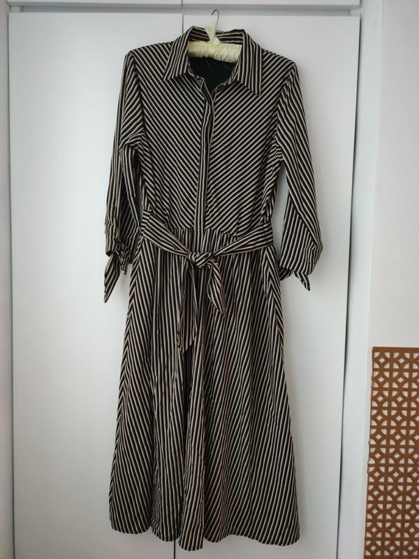 новое, но без бумажной этикетки платье, поэтому вазую, что состояние идеальное. поши безупречное. цвет, как на 5 фото. полоски: черное, белое, коричневое. ткань средней толщины. не просвечивает. по всему платку, кроме рукавов, есть подкладка. пояс сзади вшит. из переда. связывается. на рукавах завязки. пуговицы скрыты. замеры: плечи 40, талия 41 длина от плеча до талии 41, общая длина 114, длина рукава 48. можна вдягати і в офіс, і на свята. оплата на карту без возврата и кнопки "купить". смотрите другие Мои лоты. много интересного для взрослых женщин и девочек. кожаная обувь и сумки. дублянки. подписись. частые пополнения товара.