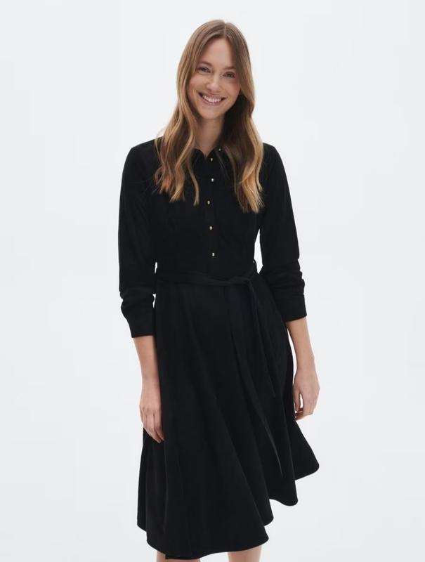 Платье выглядит как велюровое. классический воротник длинные рукава с манжетами застежка на пуговицы спереди завязка на поясе