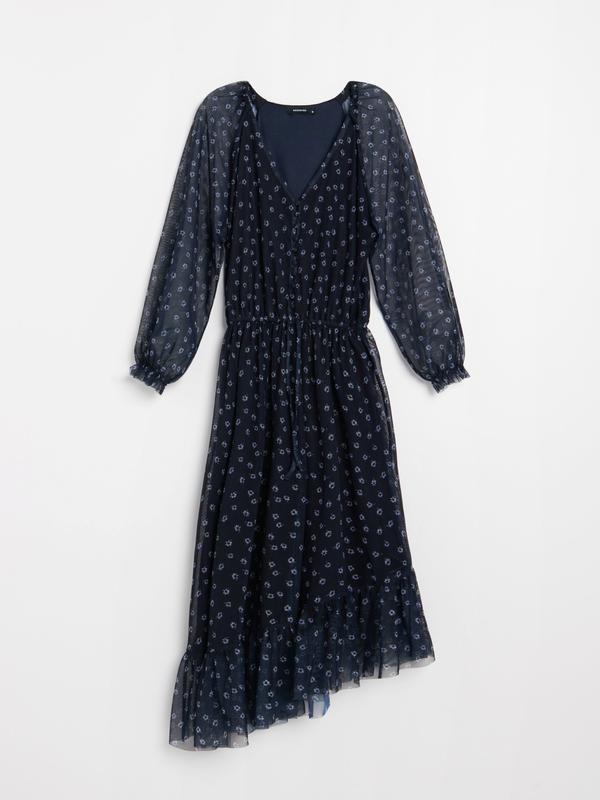 Милое фатиновое платье миди Reserved с асимметричным низом. Фатин в мелкие цветочки, мягкий, приятный на ощупь. Размер по набору М. На подкладке. Сверху застегивается на пуговицы. В талии на резинке и шнурке, рукава на резинках. Замеры +- НОГ 47 см ПОТ 33 см, на резинке, отлично тянется НОС 53 см Длина 102/120 см Внешняя сторона: 96% полиэстер, 4% эластан Подкладка: 100% полиэстер Смотрите, пожалуйста, все свои объявления — большой выбор платьев и блуз H&M, Zara, Mango, Asos различных размеров;) Подписываться на мою страницу, частое пополнение ассортимента)