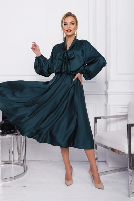 12380_зеленый Шелковое зеленое платье классического кроя с низом длиной миди. Модель с клином на горловине оснащена воротником-бантом и длинными рукавами-фонариками на резинках. Платье обладает миди длиной и оснащено резинкой на талии.