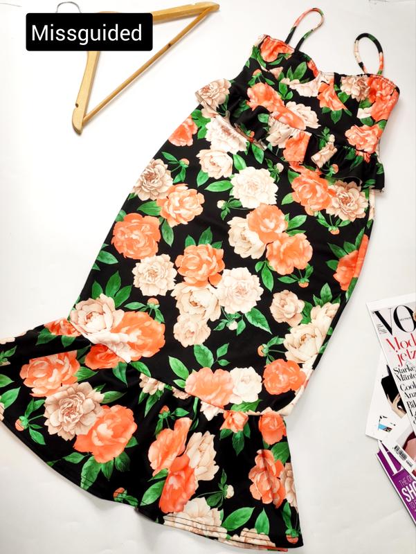 Платье футляр женская миди с оборками черного цвета в цветочный принт от бренда missguided...