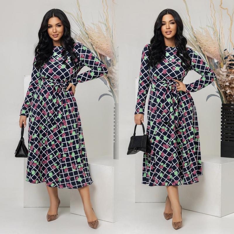 Сукня арт. david. 7416-1 Розмір: 46-48; 50-52; 54-56; 58-60 Тканина: трикотаж Довжина сукні: 126 см. Довжина рукава: 65 см. Яскрава сукня з відрізаною талією, з пишною спідницею. Пояс з основної тканини йде в комплекті. Тканина приємна на дотик, високої якості, не кошлатиться.