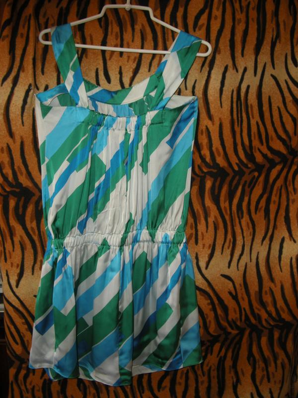 Шикарное фирменное платье,легкая воздушная ткань,похожая на шелк,яркие белые,зеленые,бирюзовые цвета,чуть ниже талии-широкая резинка,объем талии-82см.,длина платья-92см.,широкие шлейки,впереди и сзади резинка.