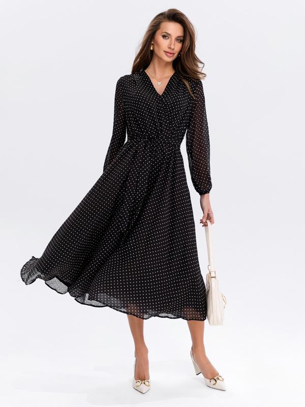 🔥Чорна шифонова сукня зі спідницею-сонце та фіксованим запахом на грудях. Відрізна талія прізібрана на резинку. Модель повністю на підкладці з тонкого трикотажу. Пояс з основної тканини у комплекті. ✔Розмір:46,48,50,52,54 🪡довжина виробу – 124 см 🪡довжина рукава (від плечового шва) – 58 см 🧵Склад: 100% поліестер 🧵Склад підкладки: 100% полиэстер 🌈Колір: чорний в горошок, зелений в горошок 🧵Матеріал: Шифон 💳Ціна 1590грн Арт42706 ‼️Для замовлення та детальної інформації пишемо у дірект📩, або коментарі ⤵️