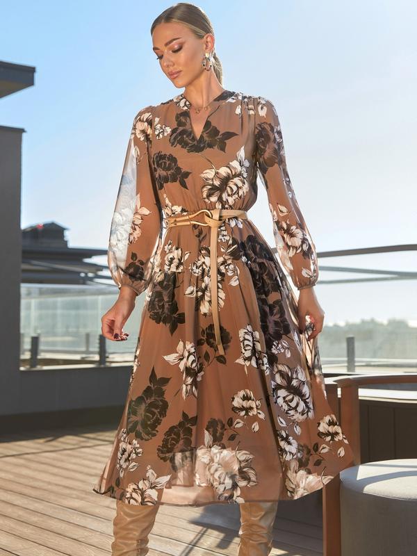 Принтованное платье с юбкой-клеш. По талии эластичная деталь. Изделие на подкладке из поплина. Комплектуется поясом из основного материала.