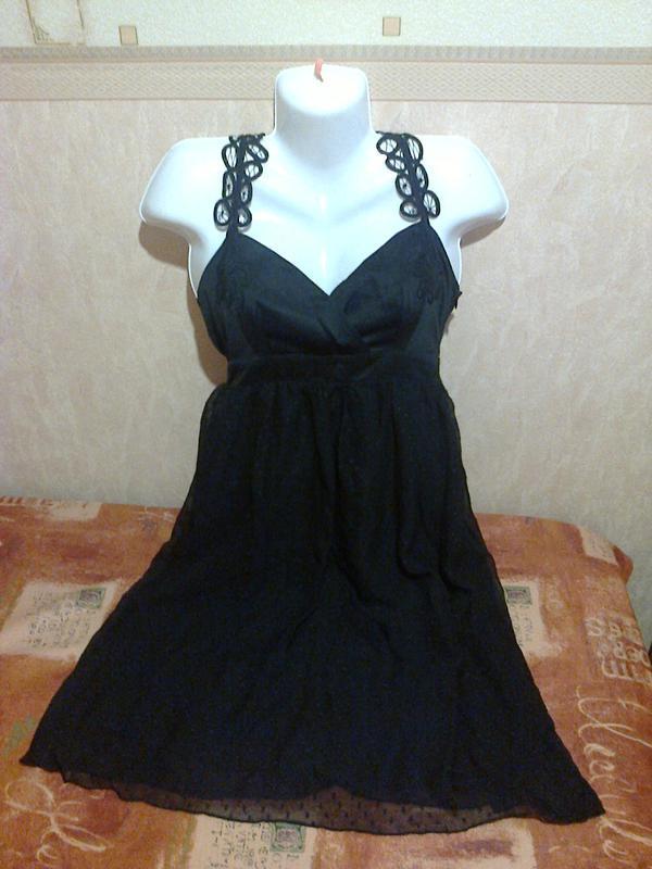 Платье-сарафан с кружевными бретелями черного цвета. Верх из атласной ткани, низ шифон на х/б подкладке. Застежка под рукой до талии. Размер указан S. Изготовлено в Китае, с указанием сайта фирмы. Сарафан в отличном состоянии, без каких-либо затяжек и дефектов. Оригинальная отделка из рулика ткани и шелковой нити. Верх - полиэстэр, подкладка - коттон. Размеры: ПОГ - 45 см ПОТ - 37 см Длина - 96-98 см