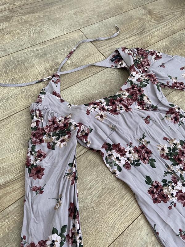 Платье с цветами и завязками за шеей, меет снизу разрез, на спине замок